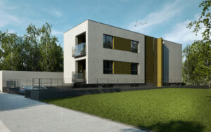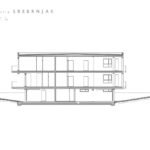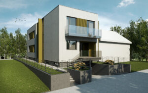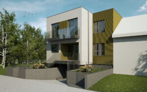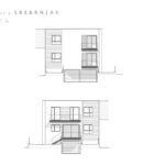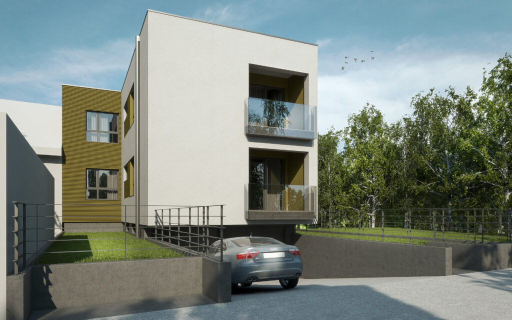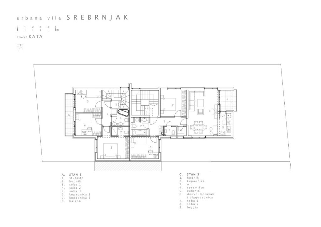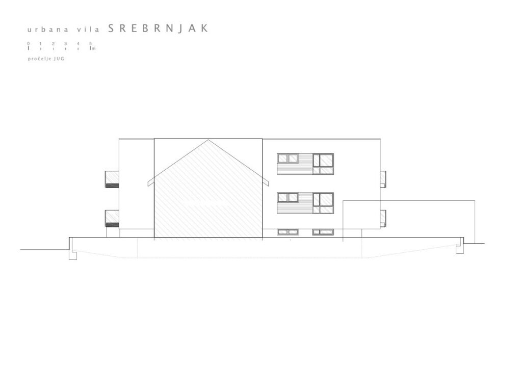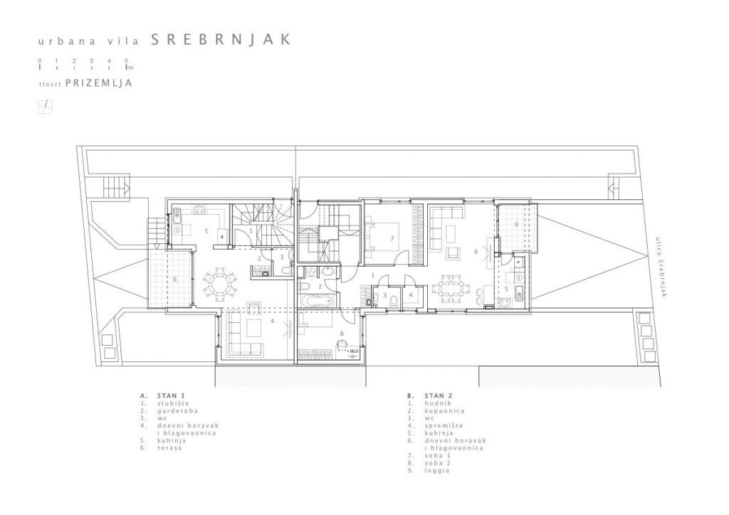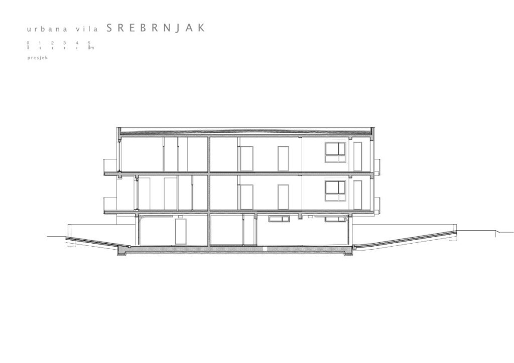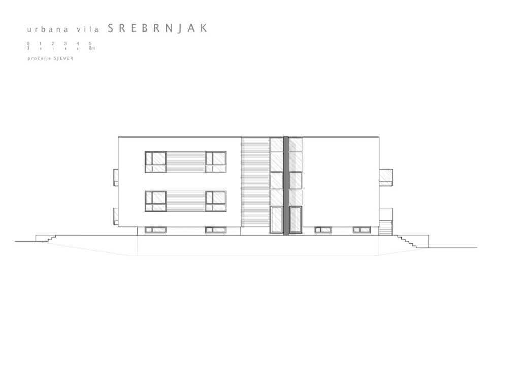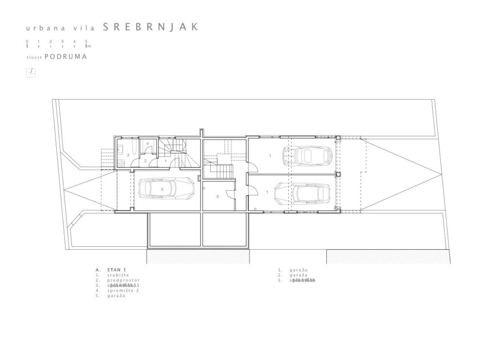 Kuća je koncipirana kao dvojni objekt sa jednim velikim troetažnim stanom za klijenta i dva manja stana sa garažama namjenjena prodaji.
